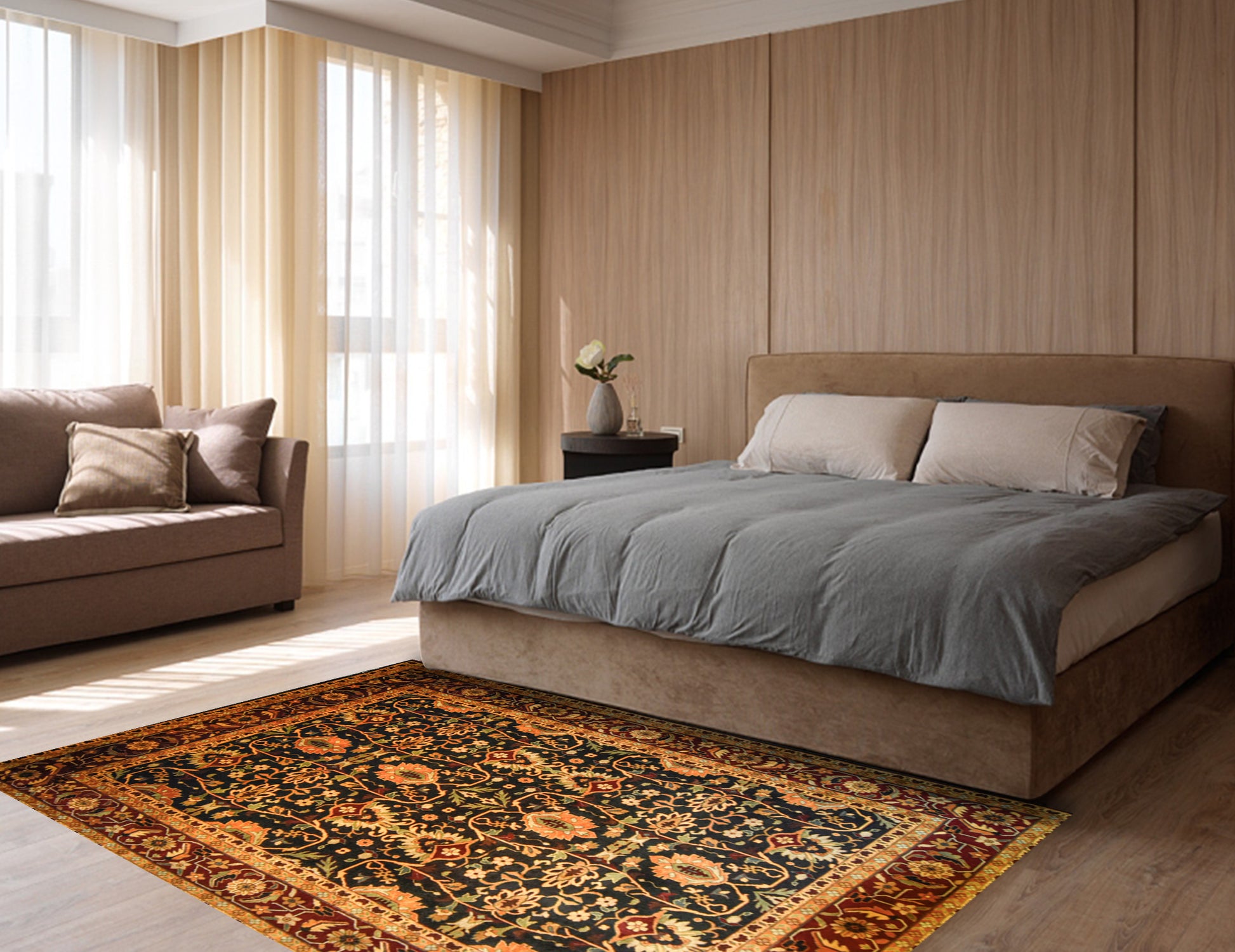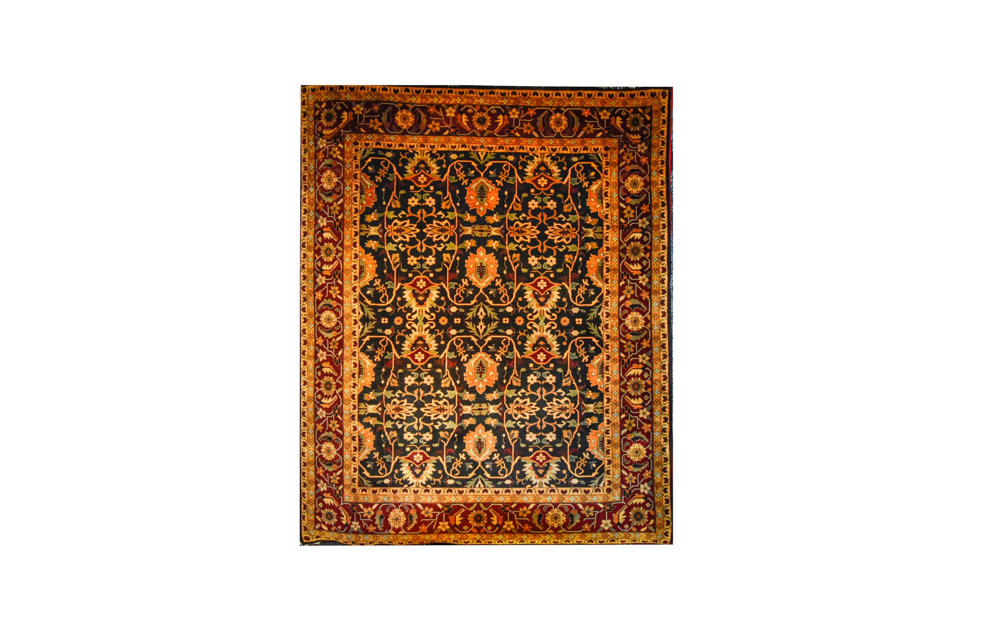 Make your room a statement with a bold and contrasting rug with black background and burgundy border, intricate flowery shapes with a touch of green and orange