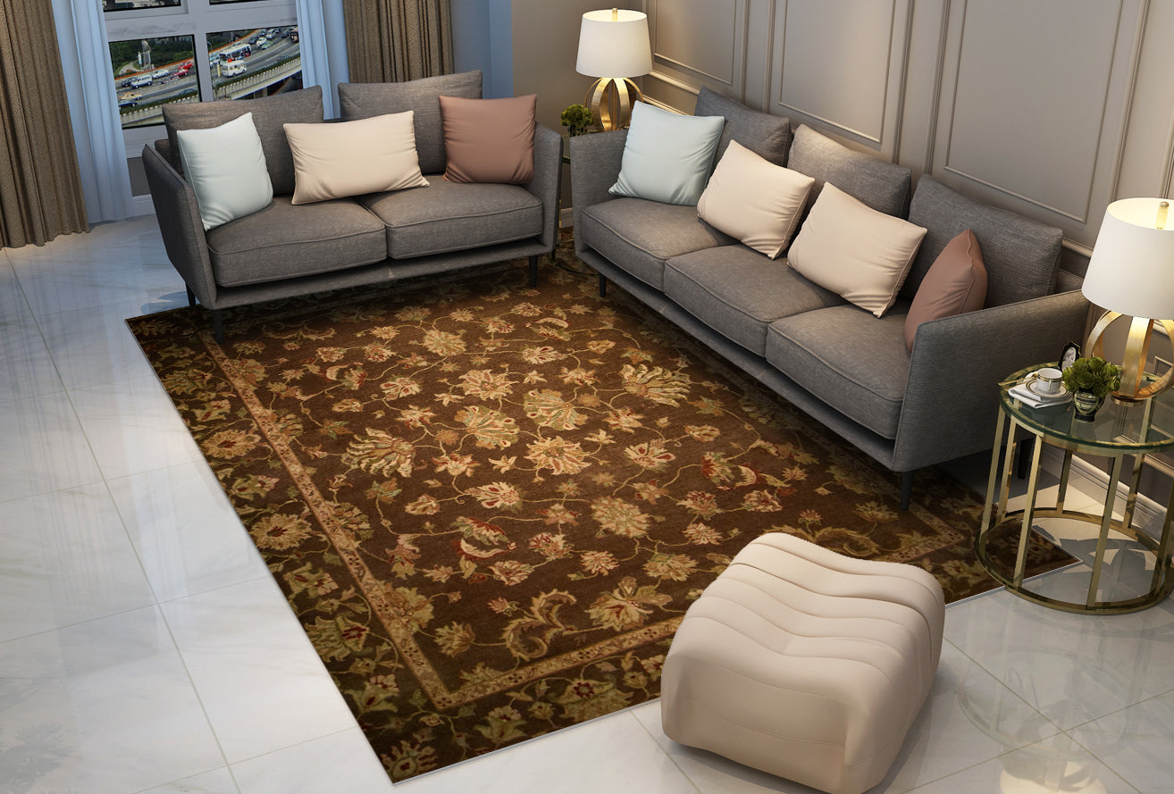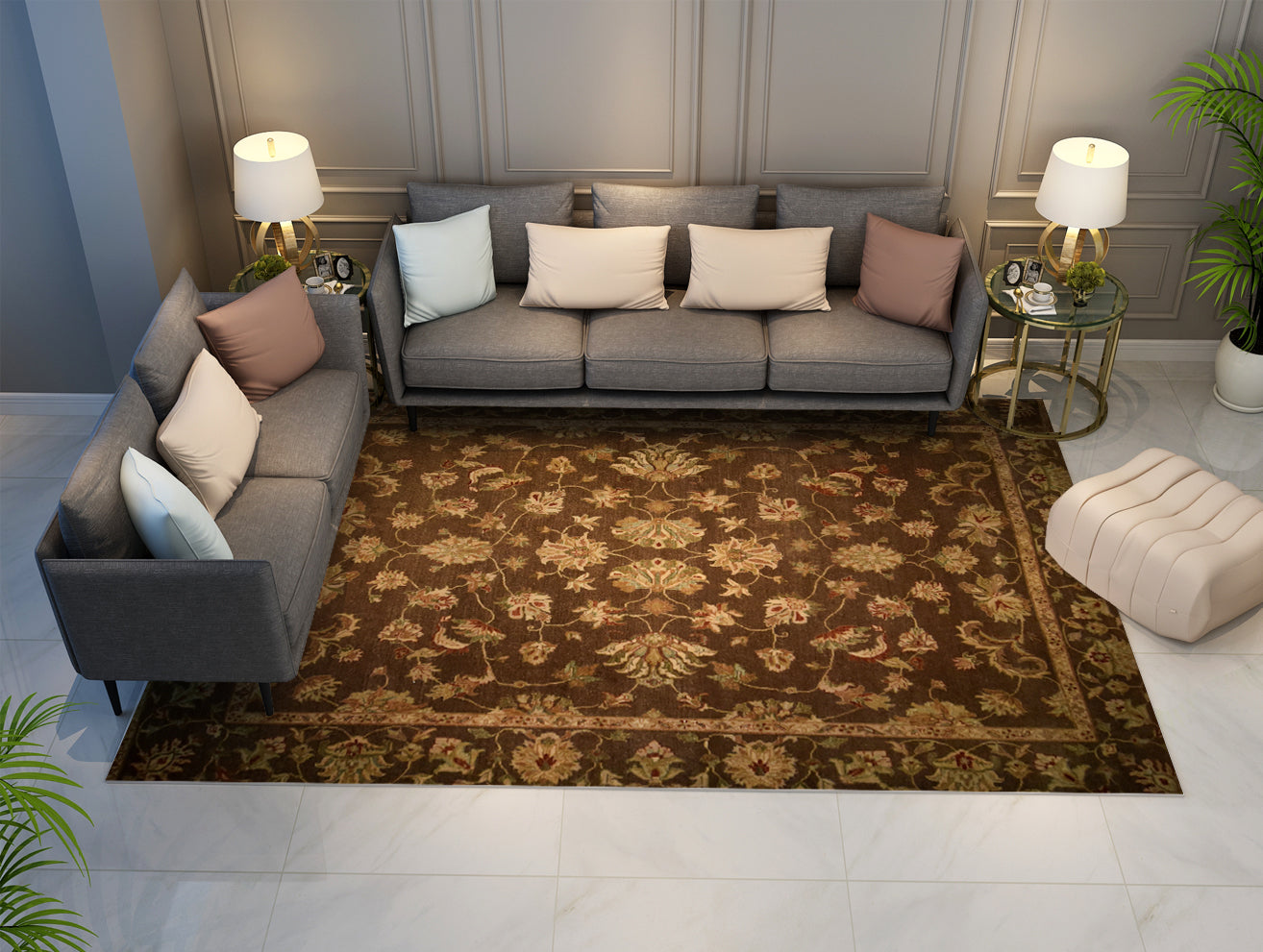 Add an accent to your home décor with a bold brown rug, border with similar color, flowery design in the tones of pastels