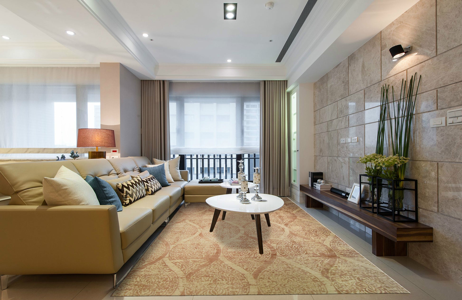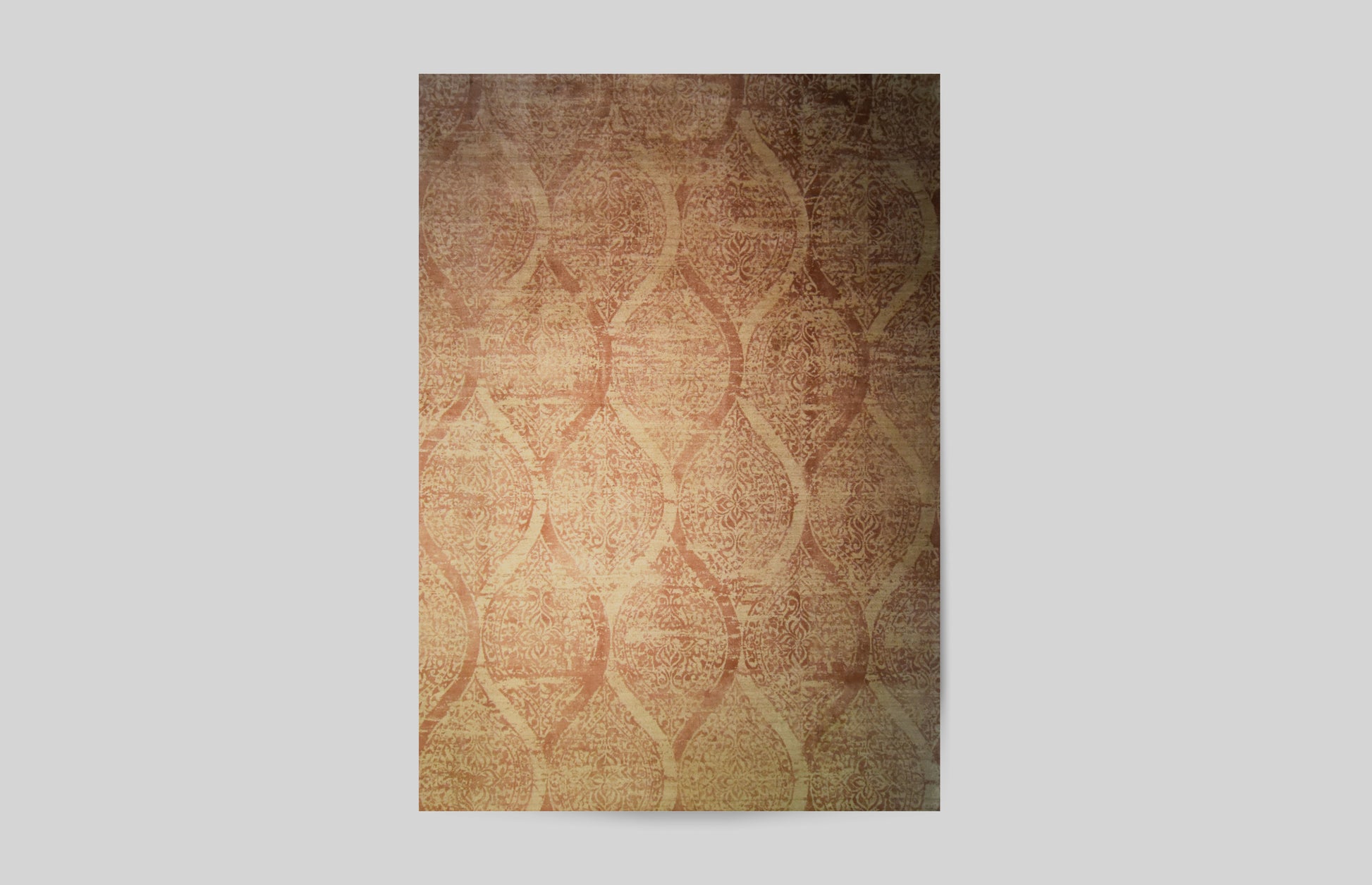 A delicate rug in a French style, beige background with large accommodating details of pink pastel, overall design