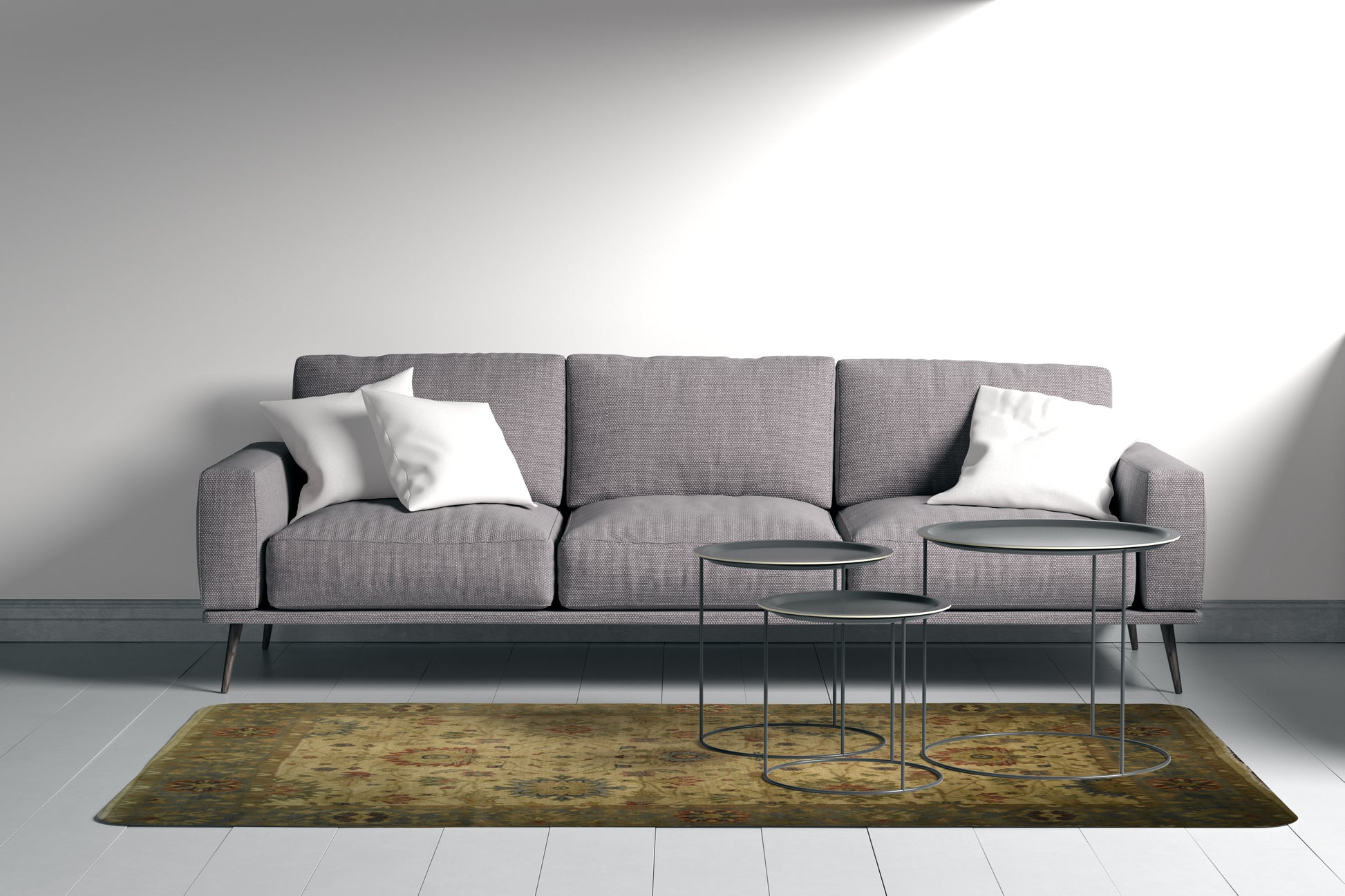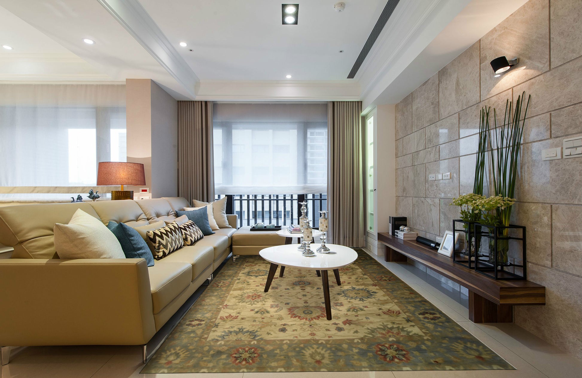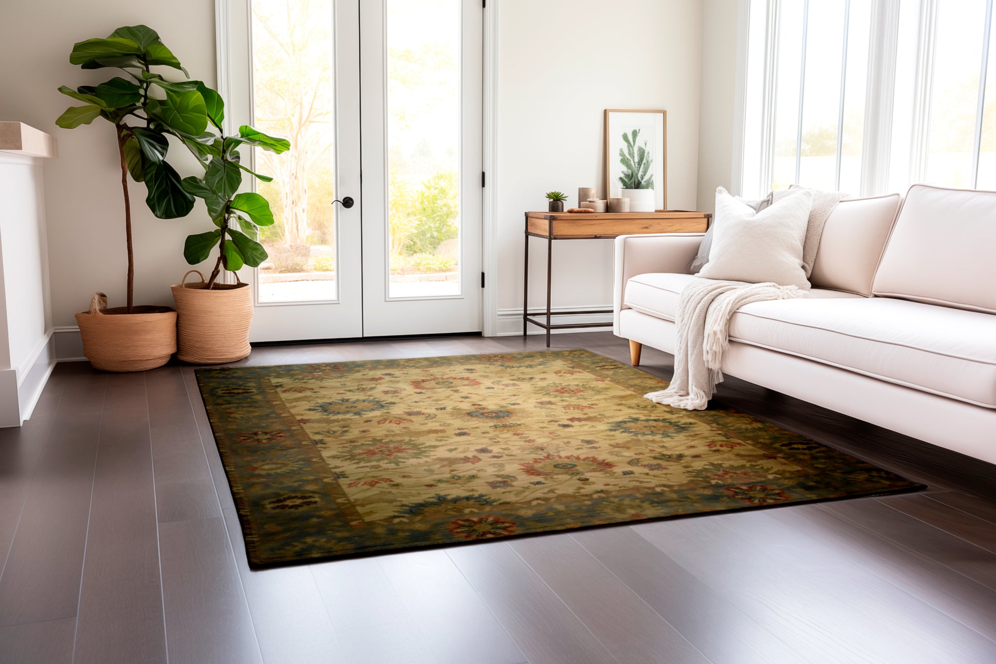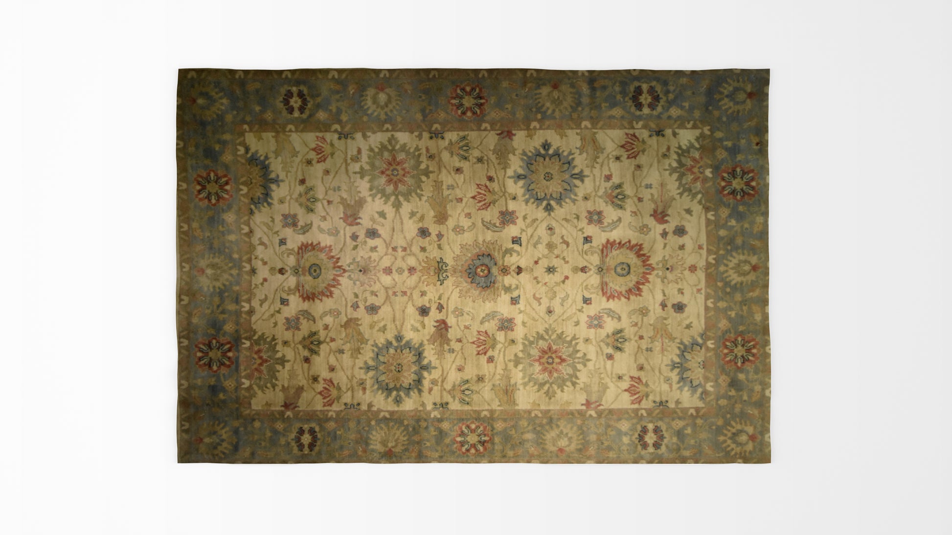 Add a quiet delicate rug to your room, beige background and faded blue border, King flowers design, large details