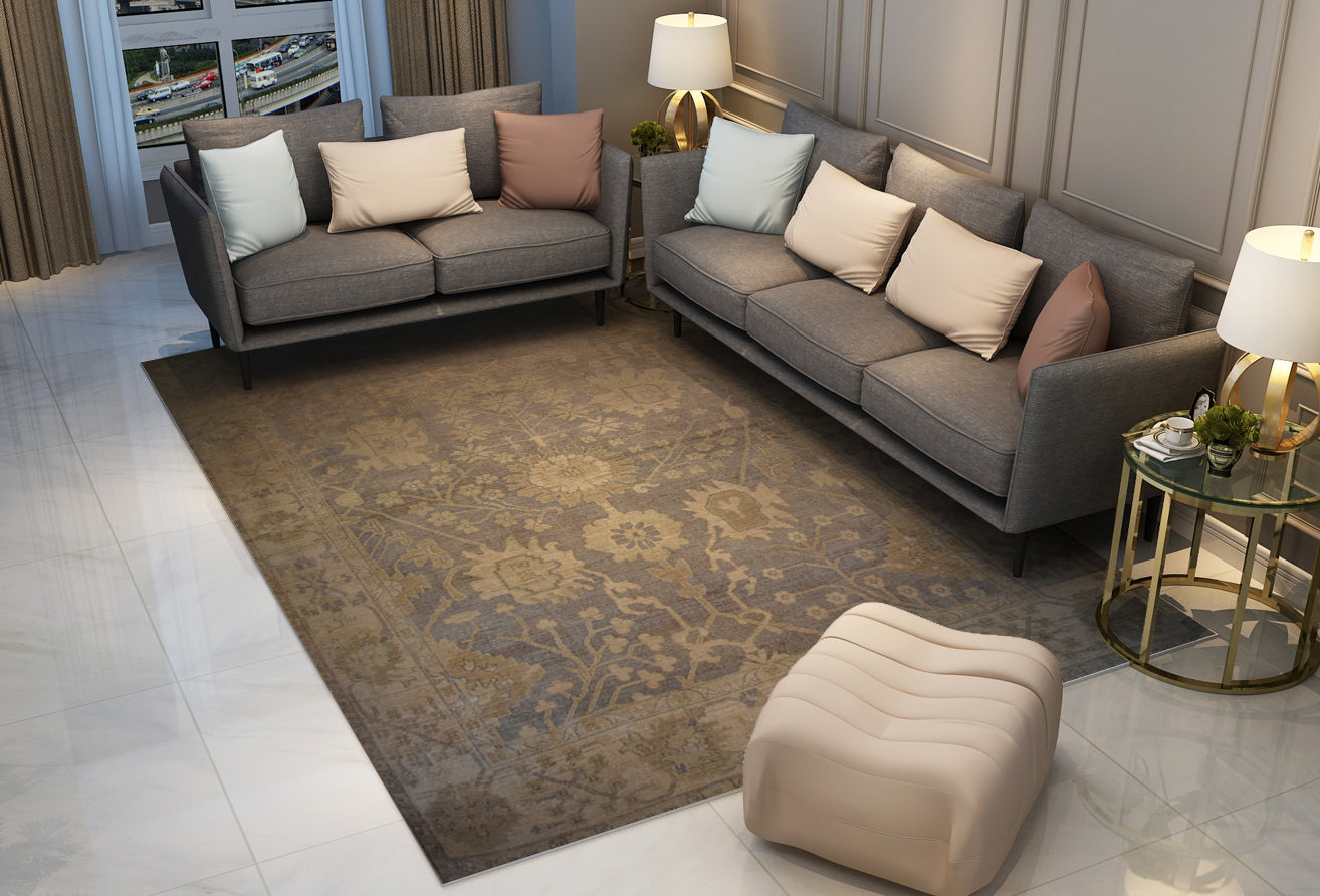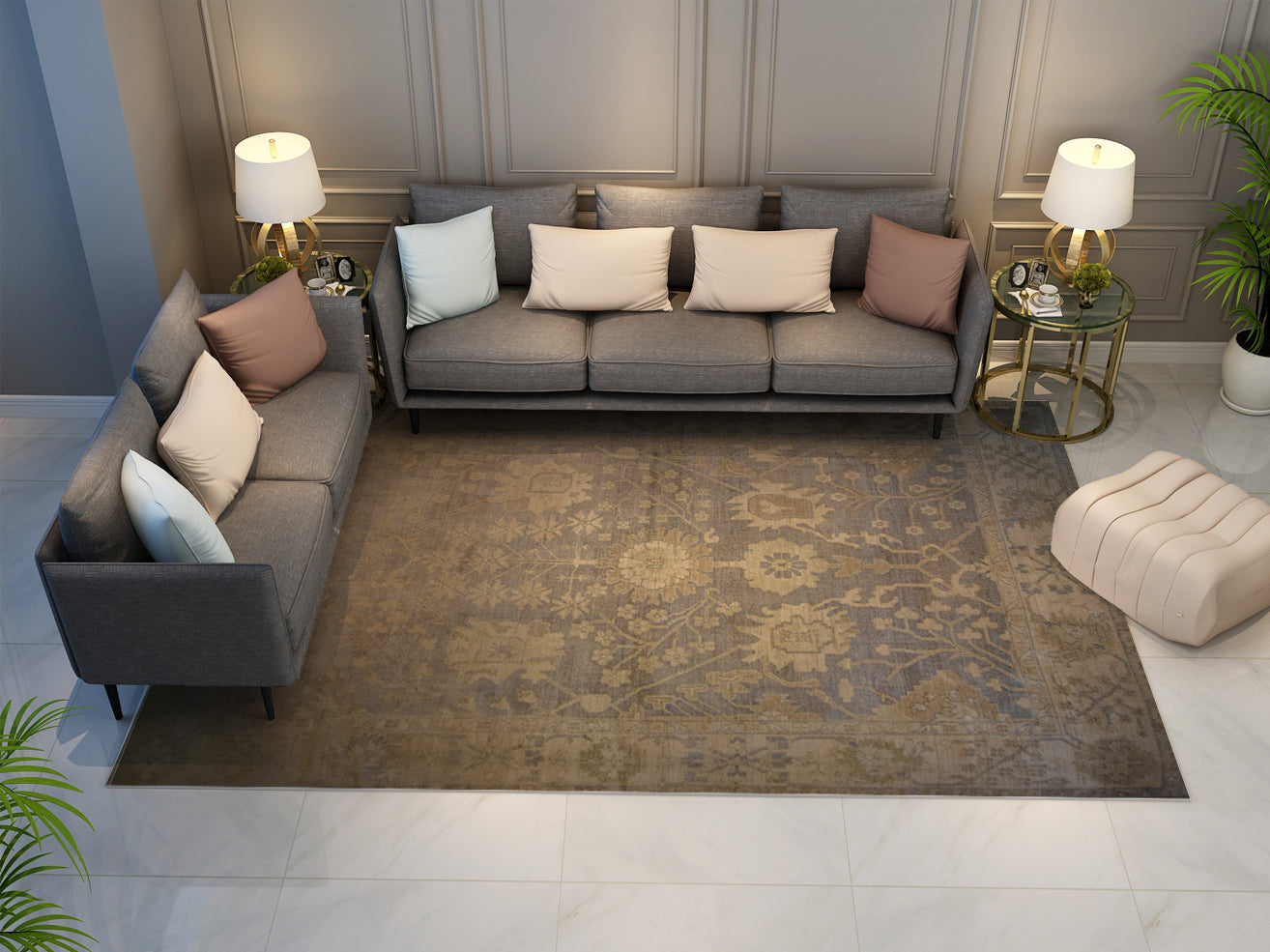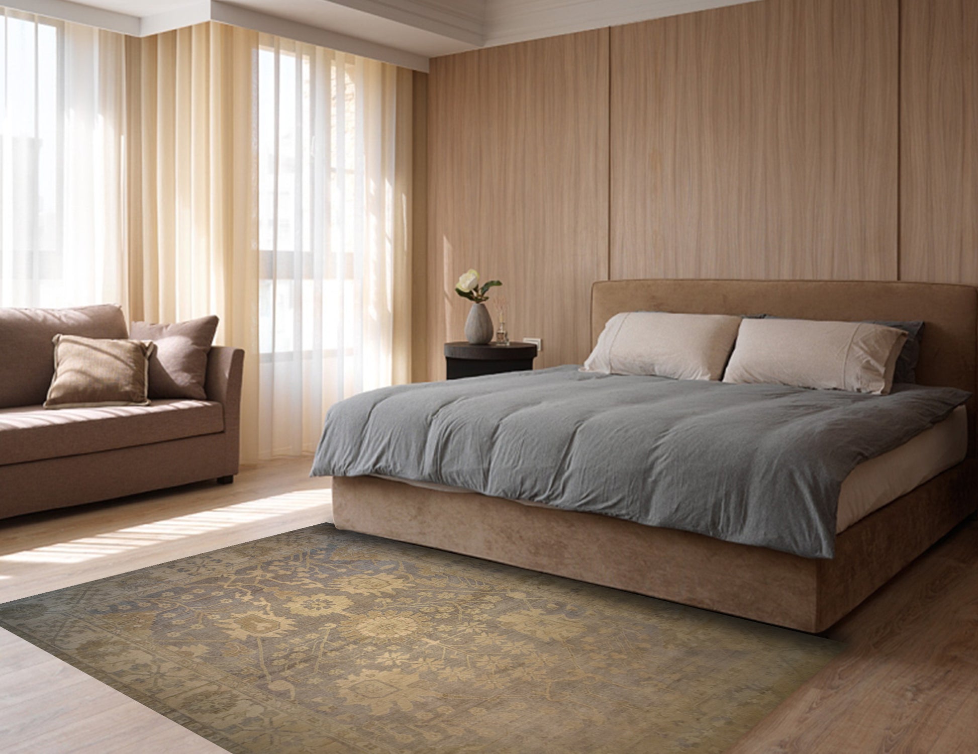 Make your room look quiet with a delicate rug, background of faded lilac, quiet gold border, King flowers design with faded gold and pastel details.